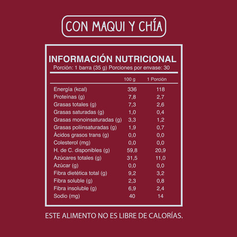 Pasta de dátiles, avena laminada, harina de avena, almendras picadas, semillas de chía (4%), cranberries deshidratados en láminas, jugo de piña concentrada, maqui en polvo (1,5%), frambuesa en polvo, canela en polvo.
