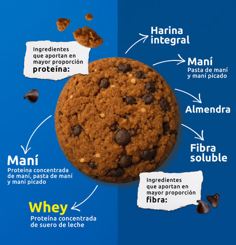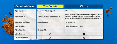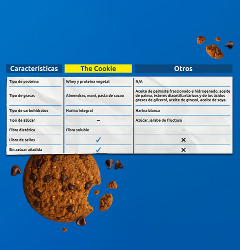 The Cookie está hecha con ingredientes reales y funcionales, seleccionados para entregar nutrición y sabor. A diferencia de la mayoría de las galletas del mercado, que utilizan harinas refinadas, azúcares añadidos y grasas saturadas. The Cookie combina harina integral, harina de almendras, proteína y fibra, logrando una textura rica, buen sabor y lo más importante, una propuesta nutricional mejor.