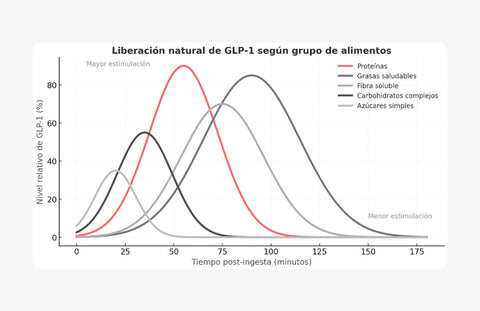 Las proteínas estimulan de forma natural la liberación de GLP-1, ya que durante su digestión se liberan aminoácidos y péptidos que activan las células L intestinales, responsables de secretar esta hormona. Esto favorece la regulación del apetito, prolonga la saciedad y contribuye a un mejor control de la glucosa en sangre.